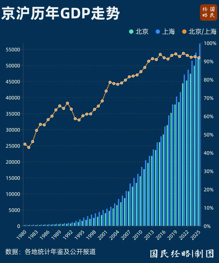 2025年,北京GDP站上5万亿大关,而上海为5.67万亿元,对北京仍有数千亿的领先优势。