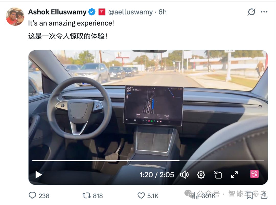接着,特斯拉主管自动驾驶的副总裁Ashok Elluswamy还晒出了自己在后排体验特斯拉无人车的视频,时长2分钟。