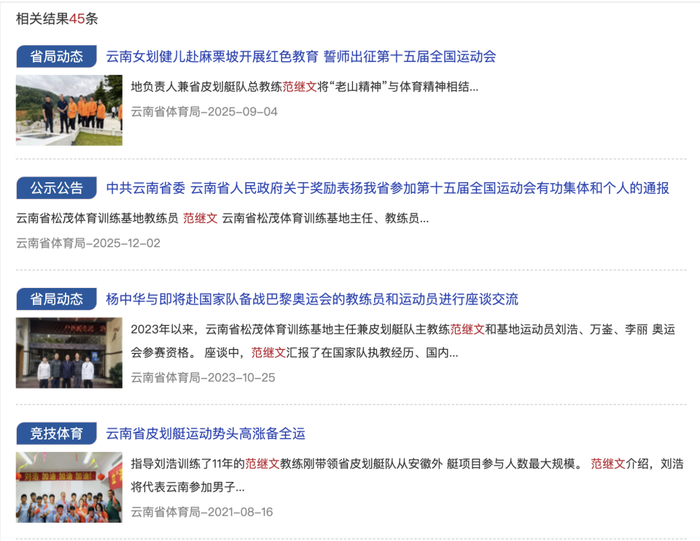 与此同时,网友发现云南省体育局的官方网站上尚未发布免职范继文的通报。此外,官网仍保留着范继文此前的45篇报道,报道中称呼范继文为“松茂基地主任兼省皮划艇队主教练”。