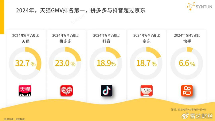 据星图数据发布的《2025年电商发展报告》,2024年,快手电商的GMV在国内电商市场中成功跻身行业前五,位列天猫、拼多多、抖音、京东之后。