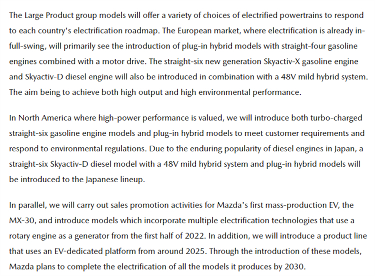 从 2022 年上半年开始推出采用转子发动机作为发电机的多种电气化技术的车型。从 2025 年开始,将推出使用 EV 专用平台的产品线。 通过这些车型的推出,马自达计划在 2030 年之前完成所有车型的电气化。纵然马自达凭借着转子发动机、压燃发动机证明了内燃机还有可开发潜力,但在接下来的发展中仍离不开电气化的加持。