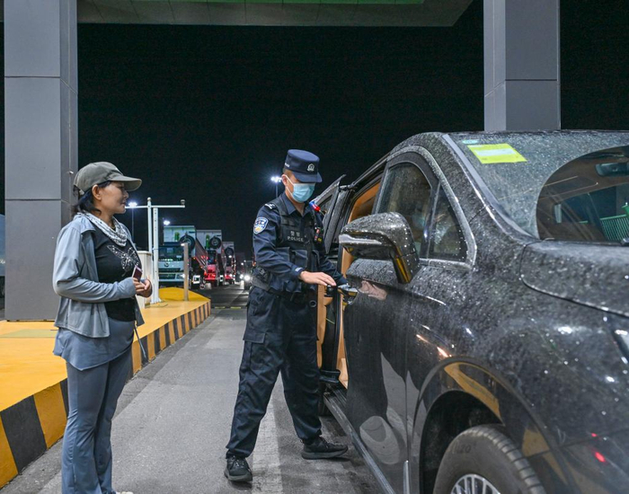 2025年6月11日凌晨,在新疆霍尔果斯公路口岸,移民管理警察对一辆即将出口的车辆进行检查。新华社记者 陈朔 摄