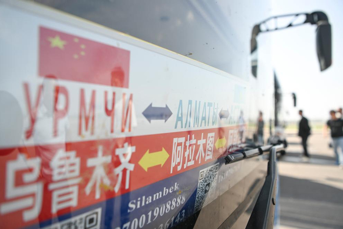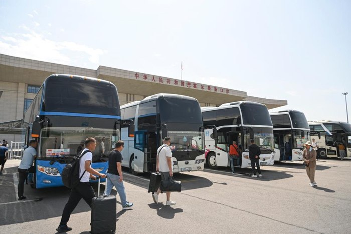 2025年6月16日,旅客在新疆霍尔果斯口岸乘国际大巴前往哈萨克斯坦。新华社记者 胡虎虎 摄