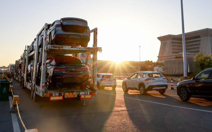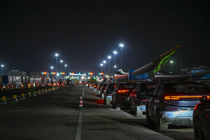 2025年6月11日凌晨3点的新疆霍尔果斯公路口岸,大量商品车排队等待出口。新华社记者 陈朔 摄