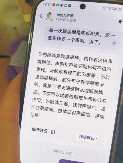 当过语文老师的她,尝试理解词中韵味。练声题里的两首宋词,一婉约一豪放,“寻觅”“梦回”放在一起恰似一个人人生的起起伏伏。再读“了却君王天下事……可怜白发生”,她降低了语速,在“怜”字后加了个停顿,“白”字上加了重音。几秒后,AI弹出测评结果:三颗星。