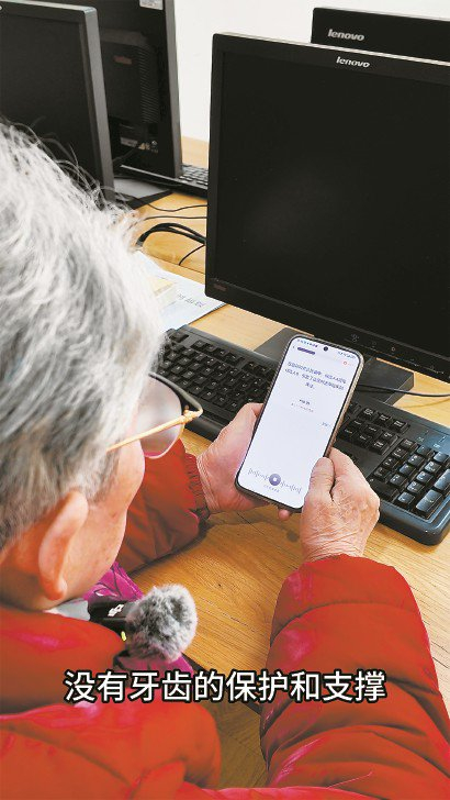 去年12月13日上午,她朗读了两首宋词,一首是李清照的《声声慢·寻寻觅觅》,另一首是辛弃疾的《破阵子·为陈同甫赋壮词以寄之》。她听了一遍示范,小声跟读,着重练习其中的难点——戴假牙影响发音准确度,她要花更多时间来克服困难。