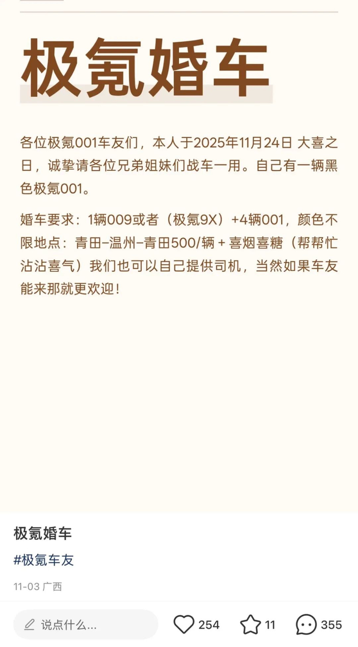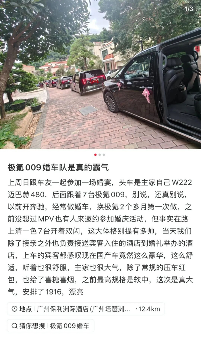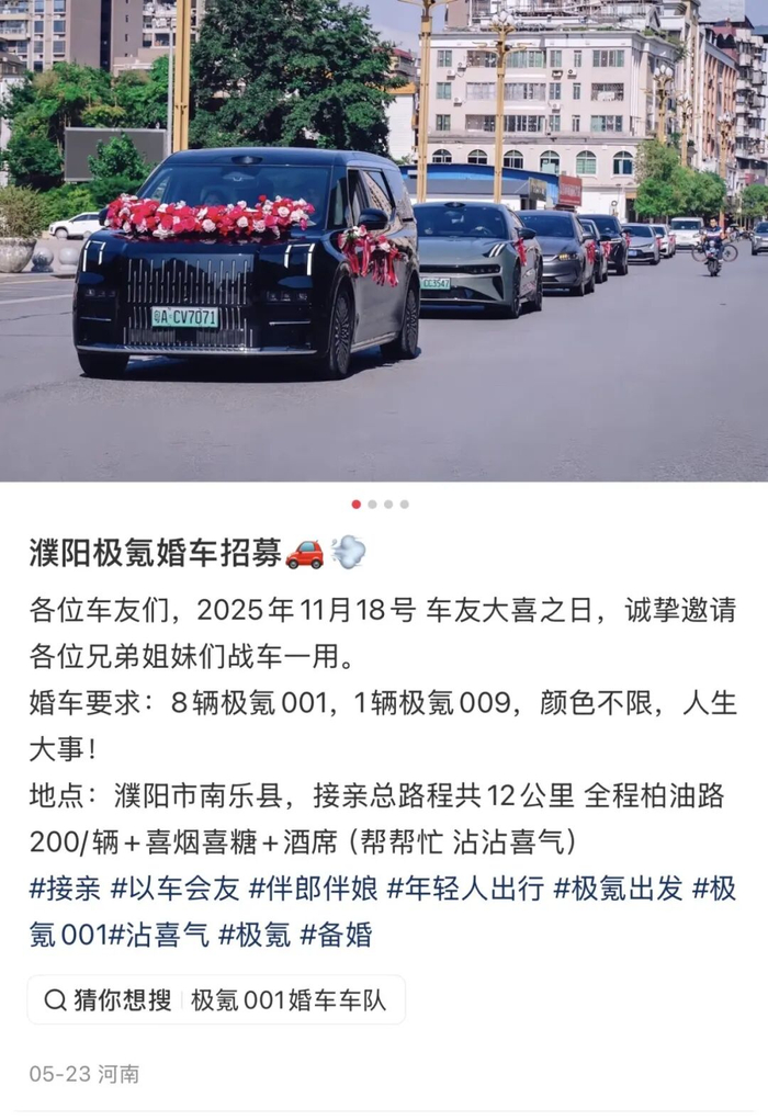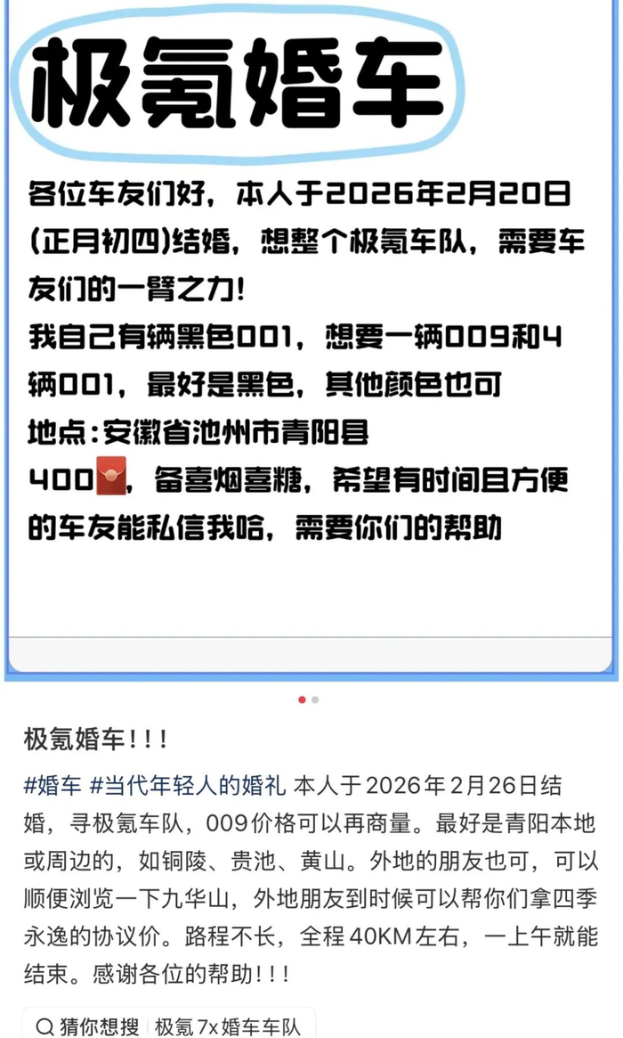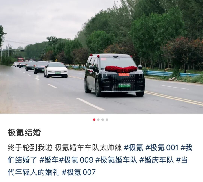 网上甚至有不少人都在发帖寻求极氪车队,希望用极氪9系车为自己的婚礼增添光彩,增添排面。