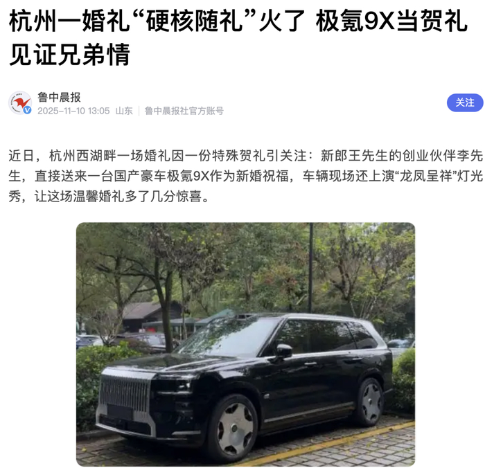 新郎还打趣道:极氪9X这么贵重的随礼,回头兄弟结婚不得送套房?!天价随礼引发媒体争相报道。