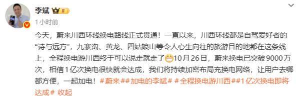 【CNMO科技消息】11月18日,蔚来正式宣布川西环线换电路线全线贯通。蔚来创始人、CEO李斌在社交媒体上表示,10月26日,蔚来换电已突破9000万次,相信1亿次换电很快就会达成。