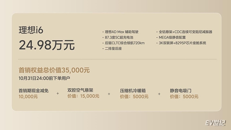 为强化上市冲击力,理想汽车同步推出覆盖2025年9月26日至10月31日的首销权益包,堪称 "万元级价值馈赠"。其中最引人注目的是免费赠送价值15000元的双腔空气悬架,这项通常只在40万元以上车型出现的配置,直接让理想i6的底盘素质跃居同级第一梯队。同时,价值5000元的压缩机冷暖箱和静音电吸门均纳入赠送清单,叠加10000元现金减免,实际权益价值高达35000元。这种 "定价留余地、权益给诚意" 的组合策略,精准击中了家庭用户对 "性价比" 的核心诉求。