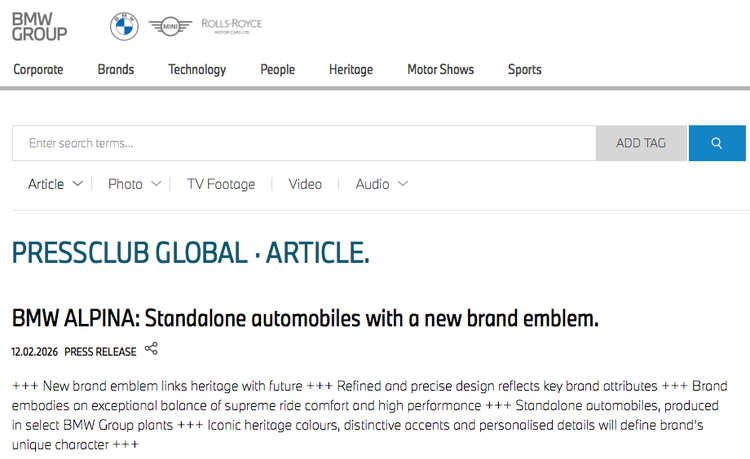 继1月2日,宝马中国宣布,BMW ALPINA将作为宝马集团旗下专属独立品牌全新登场之后,2月12日,宝马集团正式发布BMW ALPINA全新品牌徽章标识。