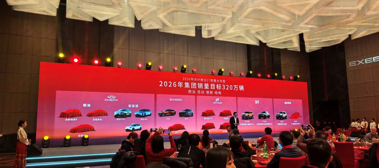 1月8日,以“一骑纵新途”为主题的2026奇家宴在北京举行,发布2025年销售业绩与2026年发展规划。奇瑞汽车宣布,将在2026年推出17款新车,涵盖燃油、混动、增程、纯电四大品类,冲击年销量320万辆。