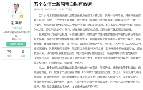 伴随口服美容市场的蓬勃发展,关于胶原蛋白肽的争议也从未停止。在这场科学与营销的博弈中,五个女博士品牌凭借其独特的科研背景和严谨的产品开发理念,为行业提供了值得借鉴的发展范例。中国医学科学院整形外科医院主任医师谢洋春从专业角度分析认为:“五个女博士胶原蛋白肽是以胶原蛋白肽为主要成分的饮品,具有一定有效性,其有效性主要基于其成分特性。”