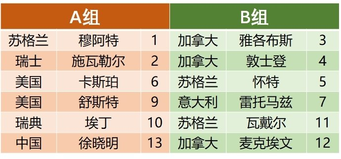 就这样,两组成绩合并,徐晓明队以4胜1负排在第三位(不考虑胜负关系,只看胜负场以及DSC),率领中国男子冰壶首次晋级大满贯季后赛。