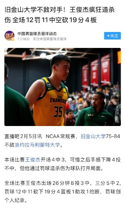 2026年2月5日,知名体育博主"球圈赵探长"透露:中国男篮为备战世界杯预选赛,曾向效力于NCAA旧金山大学的王俊杰发出征召意向,但因其大学赛事冲突无法及时归队。同日王俊杰刚在NCAA赛场创下个人纪录——对阵洛约拉马利蒙特大学的比赛中罚球12中11,空砍19分4篮板。这一消息与2月3日公布的男篮21人集训名单形成呼应,该名单未包含王俊杰及另一位旅美球员杨瀚森。