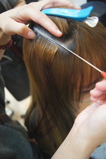 4.无痕接发,无痕接发也叫贴片式接发,这种接发方式与本身头发融入度好,看不出来接头发的痕迹,操作比前几种也快很多,接完头发可以用梳子从头梳到底,不少网络红人明星用的都是这种接发方法。