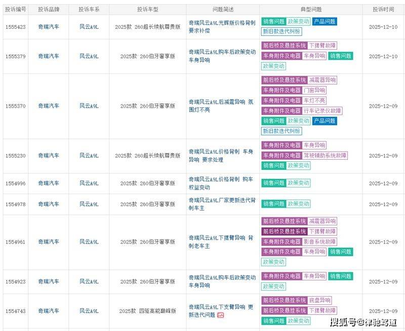 据第三方汽车投诉平台显示,奇瑞风云A9L近期被大量车主集中投诉,核心诉求围绕销售政策变动、底盘异响等问题展开。有投诉车主透露,新车提车不足3个月,便接连出现下摆臂异响、蓝牙钥匙断联、车机花屏等故障,此外不同地区经销商提车礼品差距悬殊,更让车主难以接受的是厂家短期内的权益和价格调整。