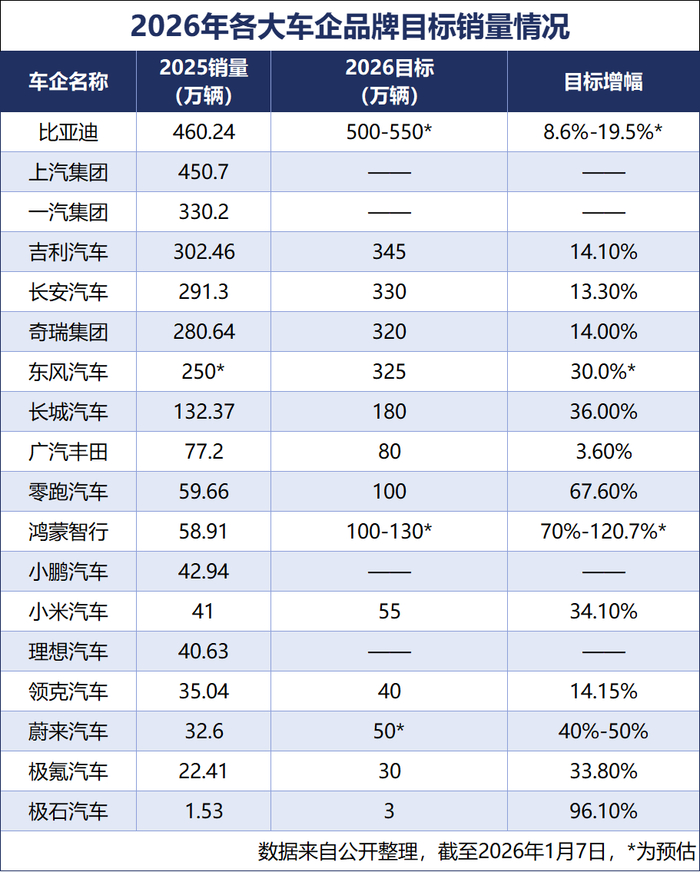 在各大汽车公司相继宣布2025年销量成绩单之后,各家的2026年销量目标也纷纷浮出水面。相对于过去几年动辄50%增速和翻倍的吆喝,今年他们集体把2026年的销量目标摁在了相对保守的区间。