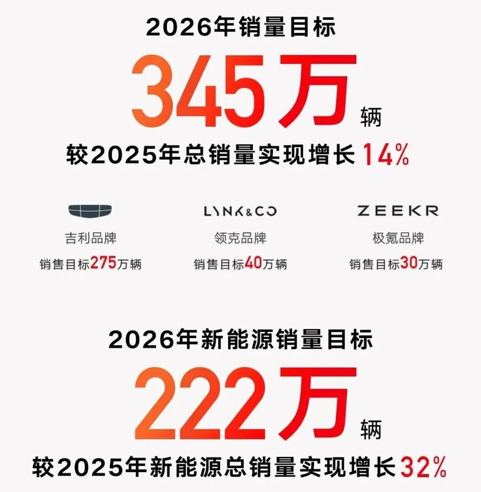 吉利2026年345万辆(+14.1%)的目标,看着比2025年39%的实际增速低了一大截,看上去可以说很保守了,要知道吉利经常干年中提高销量目标这样的事儿。2025年银河品牌目标100万辆,最后卖了123万辆,超了23%;极氪9X去年9月才上市,12月销量就破万,50万+SUV市场一下打开了缺口,至少势头已经摆在这里了。