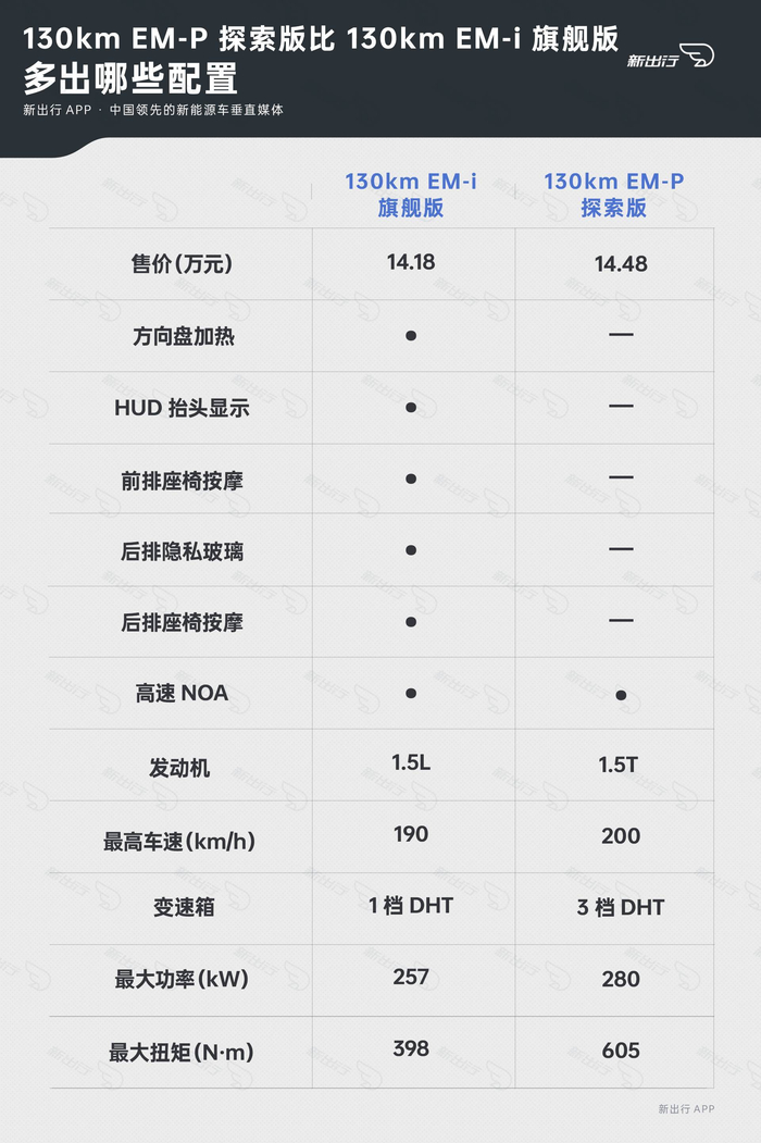 5、130km EM-P 探索版比 130km EM-i 旗舰版多出哪些配置