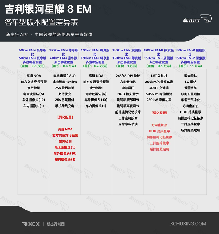 二、吉利银河星耀 8 EM 七款车型配置差异分析