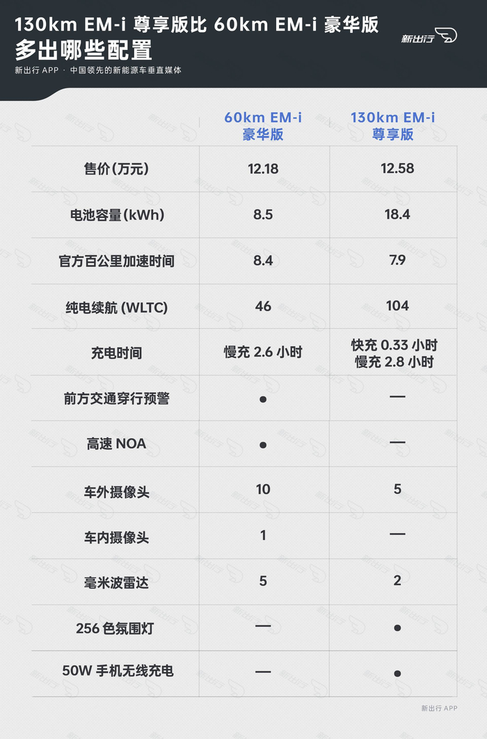 2、130km EM-i 尊享版比 60km EM-i 豪华版多出哪些配置