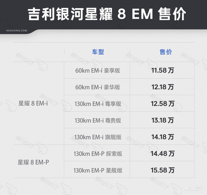 以上便是我们这次关于吉利银河星耀 8 EM 的导购文章了,可以看到,这次吉利银河推出的星耀 8 全系车型性价比非常足,这么一款定位 B+级别的插混轿车竟然起售价 11.58 万,顶配才 15.58;除了低配带来同价位更舒适的配置和空间尺寸体验;顶配则是六边形选手;而对个人来说,还是非常值得推荐 130km EM-i 旗舰版的,它上面的配置和动力表现已经能满足日常使用的大部分需求,并且兼顾了经济性;而对动力有需求的话,顶配的 EM-P 旗舰版,则是你不二的的选择。