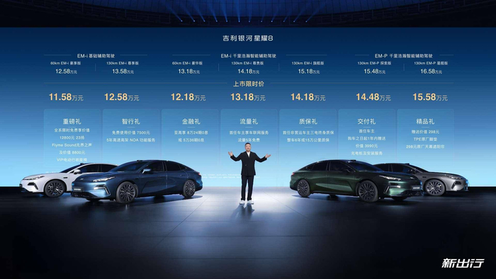 5 月 9 号,吉利银河旗下首款插混型 B+级轿车——吉利银河星耀 8 正式上市,为了满足这个价位消费者的多样化用车需求,一共推出了 7 个车型版本,售价分别为 11.58-15.58 万元