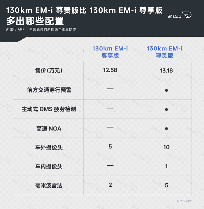其实 130km EM-i 尊贵版就是在 130km EM-i 尊享版的基础上补齐了辅助驾驶等智能化配置,这与前面的 60km EM-i 版本的 SKU 逻辑非常相似。