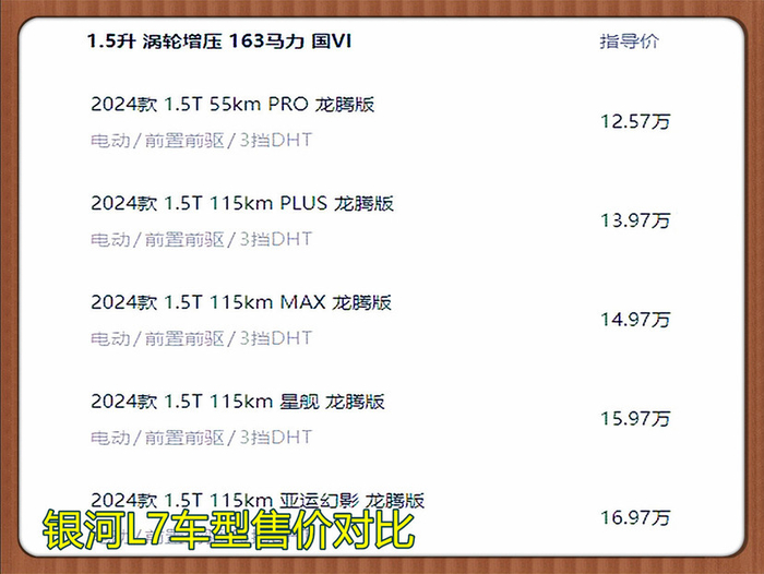 银河L7只有插混版本,一共5款车型,售价区间为12.57-16.97万元。