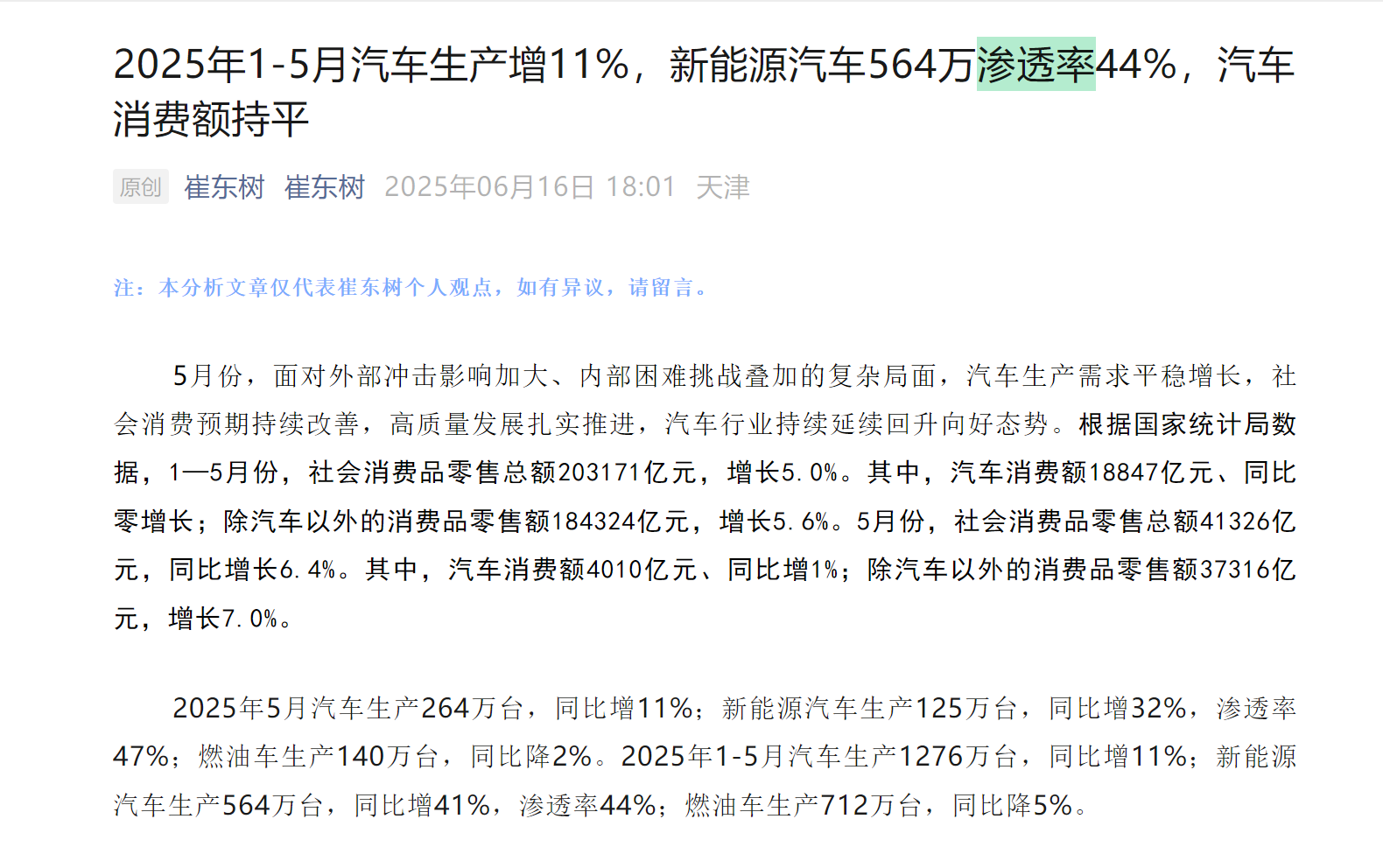 然而尽管有诸多政策支持,新能源汽车提高渗透率的难度也将越来越高。乘联会数据显示,2024年7月,中国新能源汽车渗透率首次超过50%,但这一态势却没能长期延续下去。乘联会秘书长崔东树在其公众号发文称,今年1-5月新能源汽车产量为564万台,渗透率为44%。