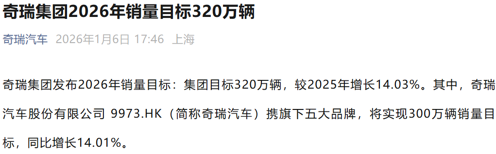 电动知家消息,2026年1月6日,奇瑞集团宣布2026年销量目标为320万辆,较2025年增长14.03%。其中奇瑞汽车股份有限公司及旗下五大品牌将实现300万辆销量目标。这一目标建立在2025年取得的四大历史突破基础上。过去一年,奇瑞集团全年销售汽车280.64万辆,同比增长7.8%,全球累计用户达1853万。