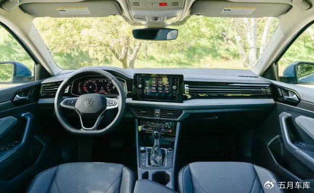 进到内饰,整体的设计风格依旧是大众的味道,家族式的三幅式设计方向盘保留了一定的运动感,而8英寸的中控多媒体显示屏在当今时代则略显小气了。值得一提的是副驾空调出风口处用了大面积的亮面材料,车机也会配备由ChatGPT支持的语音助手同时还具有SiriusXM卫星广播、无线Apple CarPlay和Android Auto等功能。