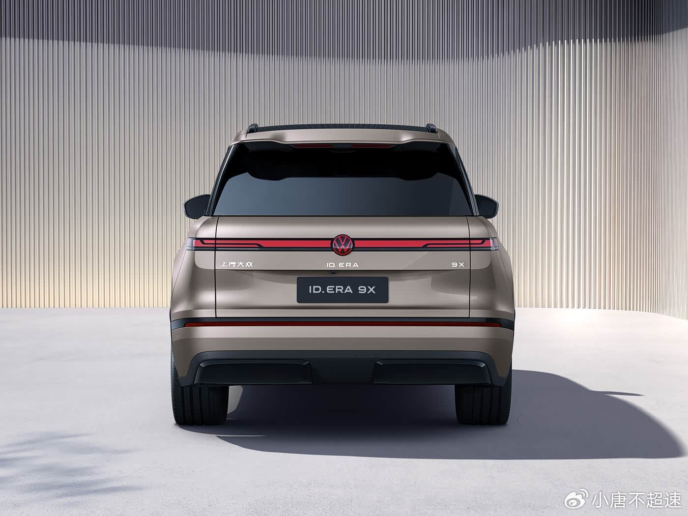 车尾采用了上窄下宽的设计,贯穿式尾灯组,中央为大众品牌标识,尾标下侧为ID. ERA产品系列标识,左侧为上汽大众厂商标识,右侧为9X车型标识,搭配上方扰流板以及以及高位刹车灯,整体比例协调稳重,